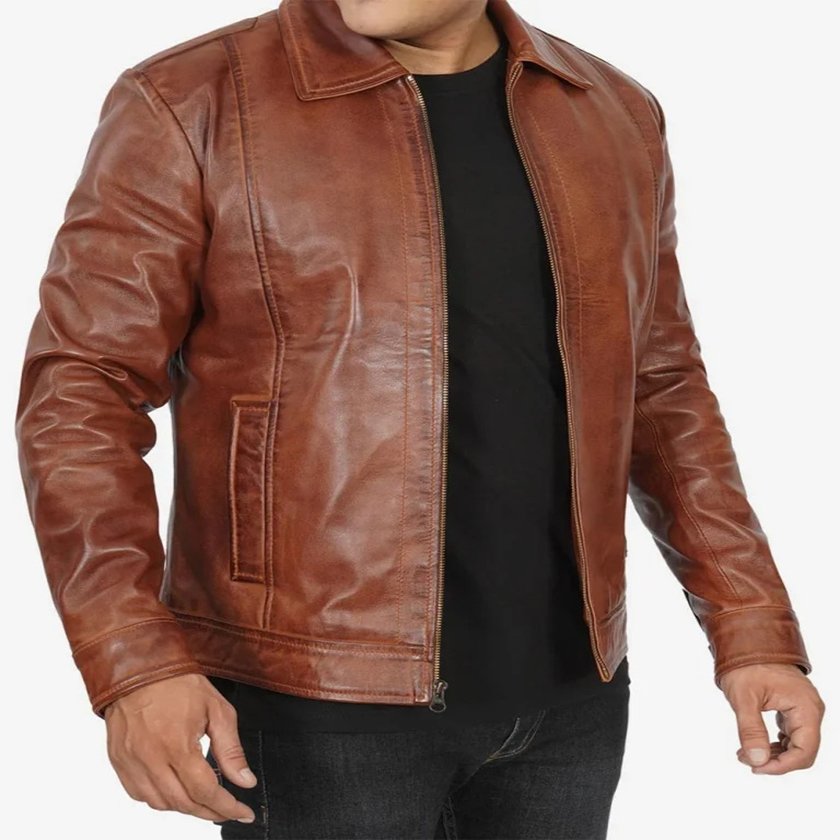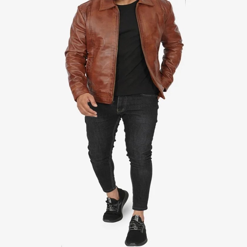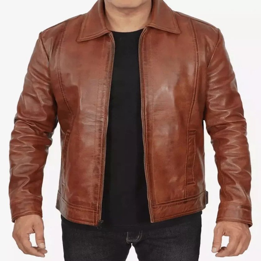 This shirt collar cognac wax jacket is an incredible addition to men’s wardrobe to look cool in classic style in any season. This collared jacket is made from real leather and is available in cognac color. Soft lining is stitched internally to provide great comfort and a relaxed feeling. It has a front zip closure, a shirt-style collar, two pockets outside and three inside. An ultimate fashion jacket for men that you can wear with casual and formal clothing.