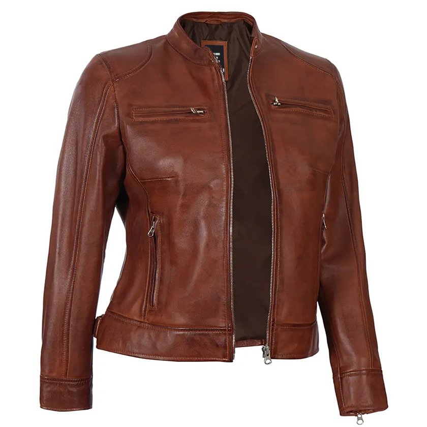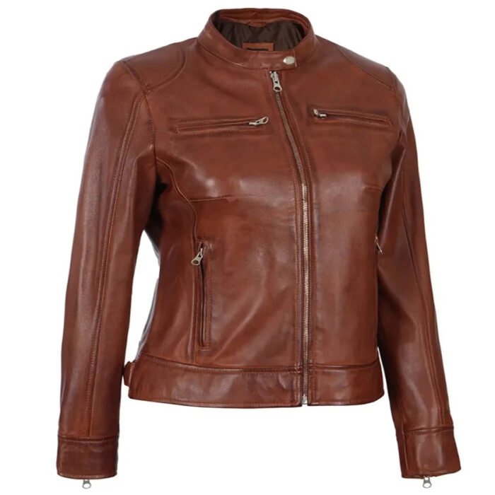Cognac Slim Fit Leather Jacket For Women