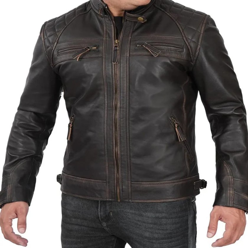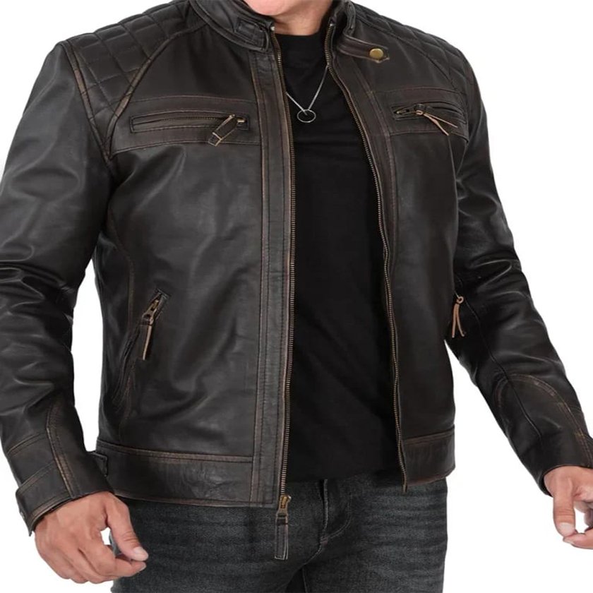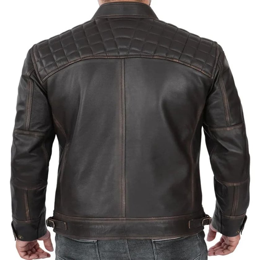 Embrace Boldness: Men’s Distressed Leather Biker Jacket in Brown Quilted Style.
