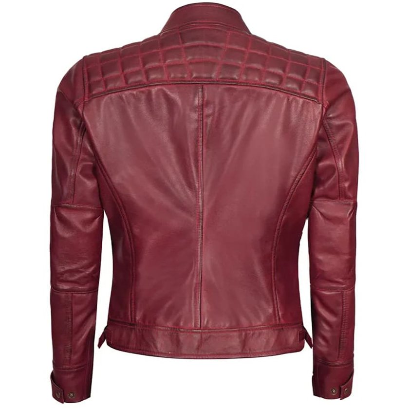 Our maroon-color leather jacket for women is an everyday-style biker jacket It is crafted from real lambskin leather & an internal soft skin-friendly polyester lining that ensures comfort and warmth. It is durable and modern, which fashion-oriented women often look for. The jacket has a quilted design on the shoulders and inside & pockets to secure your belongings.