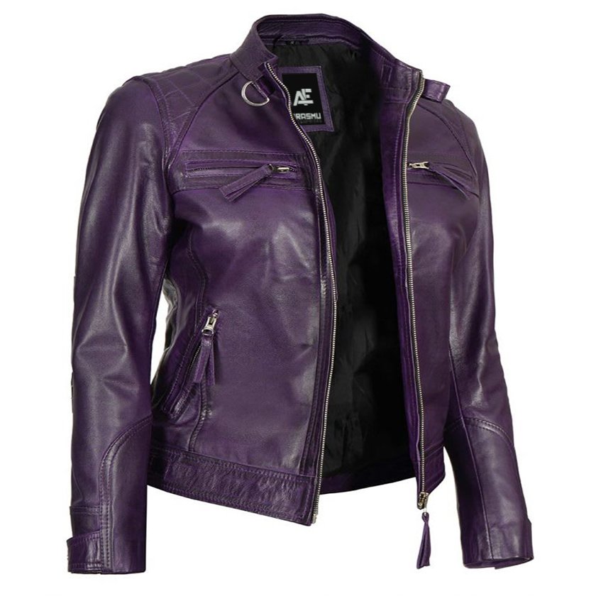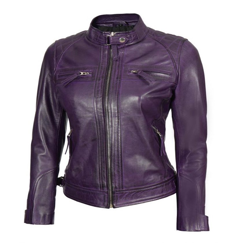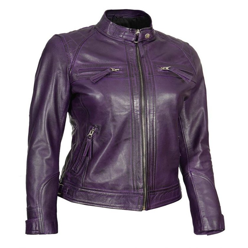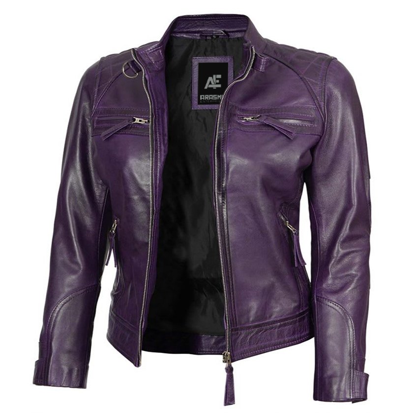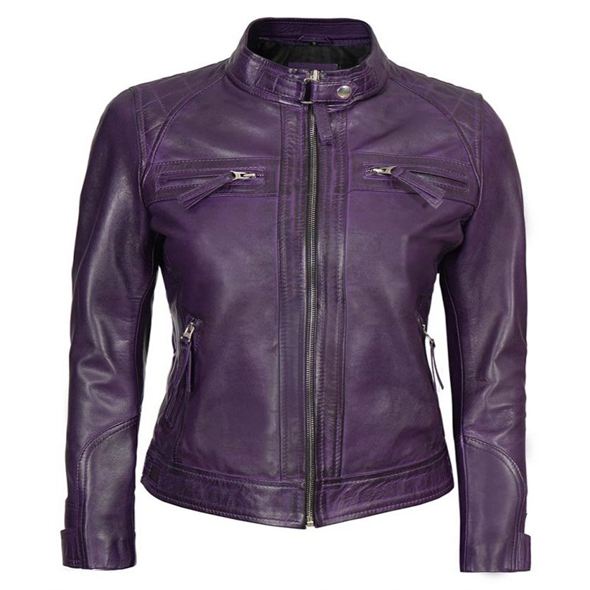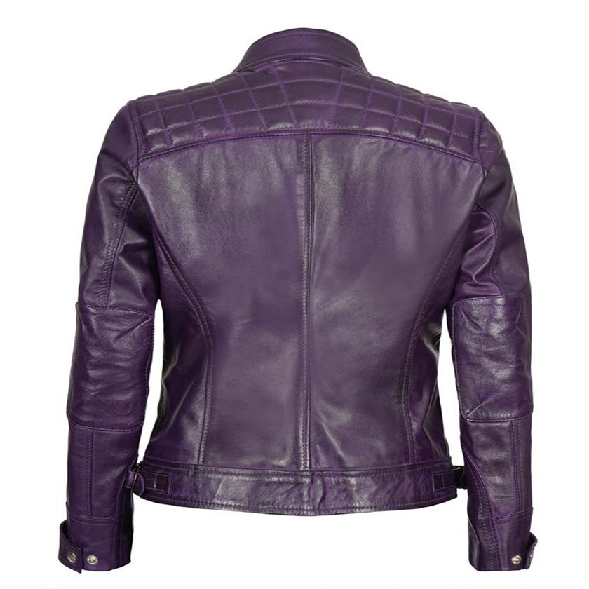 This purple quilted women’s leather jacket is a must-have addition to women’s wardrobe. It is made from 100% real lambskin leather that provides extra comfort and soft feel. Features include snap button collar, quilted shoulder, slim fit cut, and multiple pockets. A perfect outfit to wear during winter and spring to keep yourself warm and stylish.
