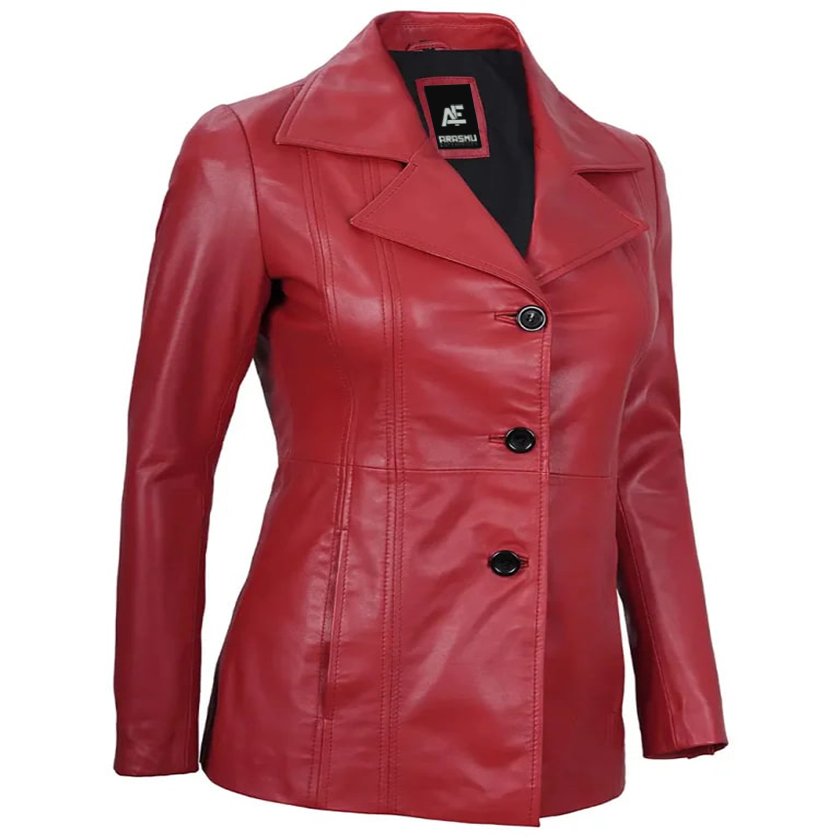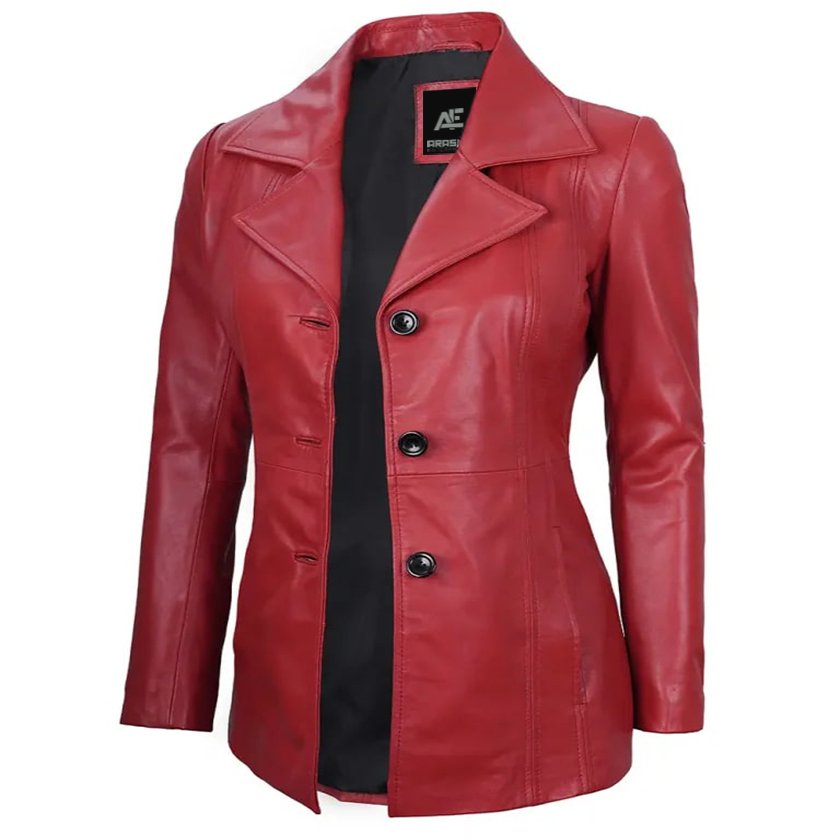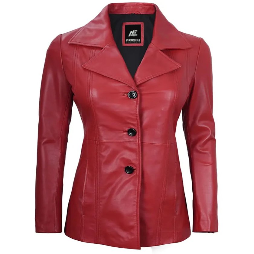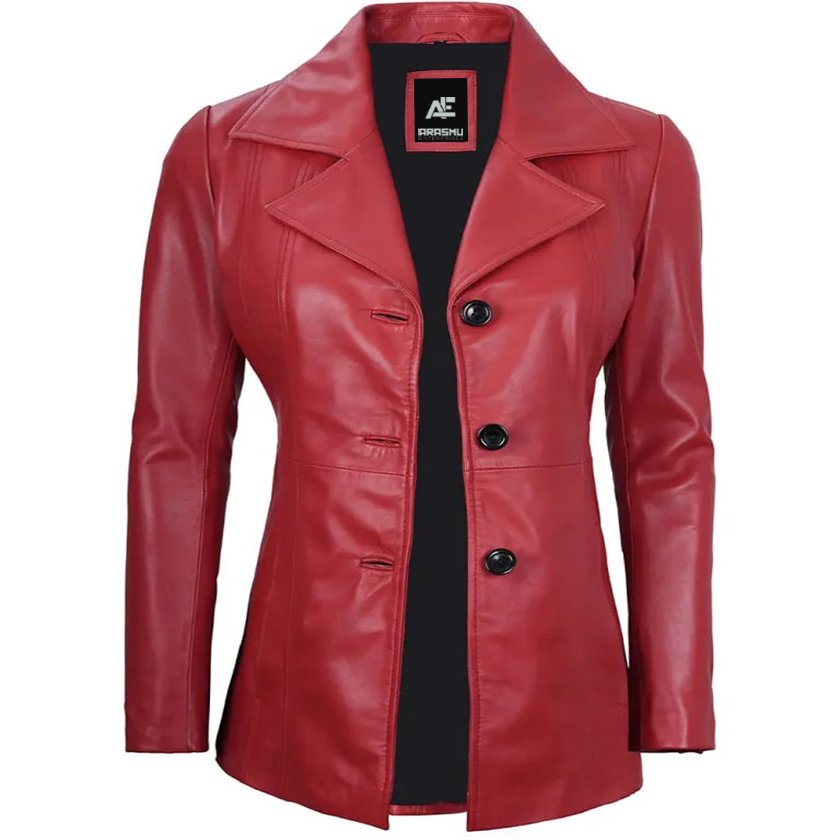 Make a statement with our Women’s Red Leather Blazer, a sleek three-button closure and sophisticated lapel collar. Made from real lambskin leather, this blazer exudes luxury and boldness. The striking red hue adds a vibrant and energetic touch, making it perfect for both professional settings and social events. With a tailored fit and stylish design, this blazer provides a sleek silhouette, ensuring you look sophisticated and chic wherever you go.