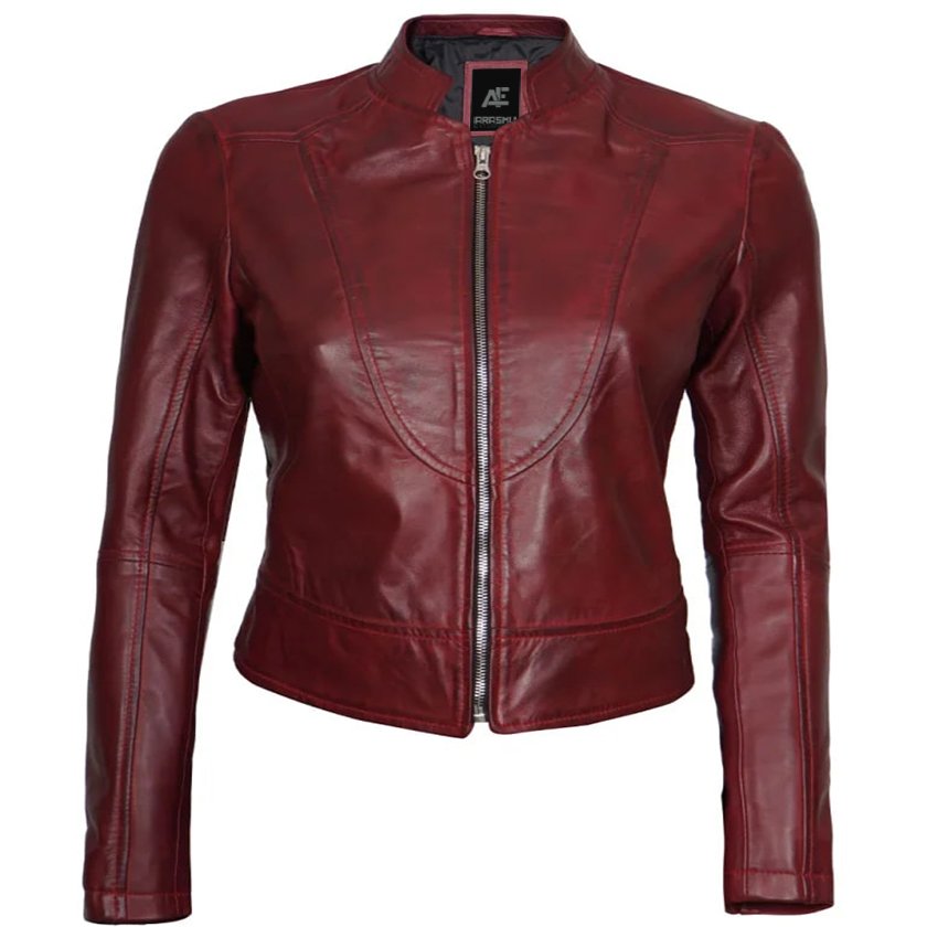 Give a lovely touch to your style by wearing this fashionable maroon leather jacket. It is manufactured from real lambskin to ensure maximum longevity and comfort. Featured with the distressed exterior, mandarin collar, straight central zipper closure, long sleeves, and internal polyester lining.