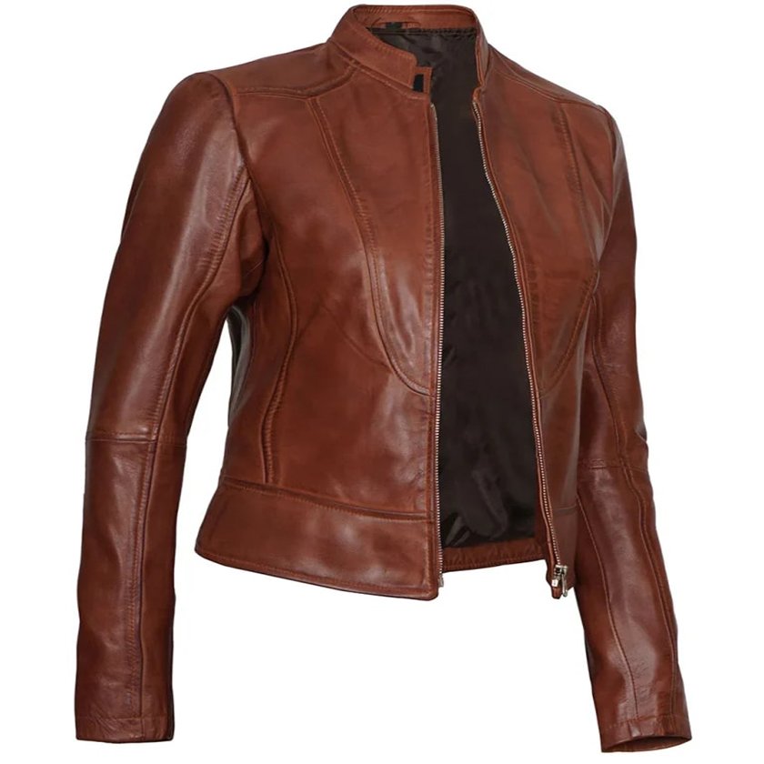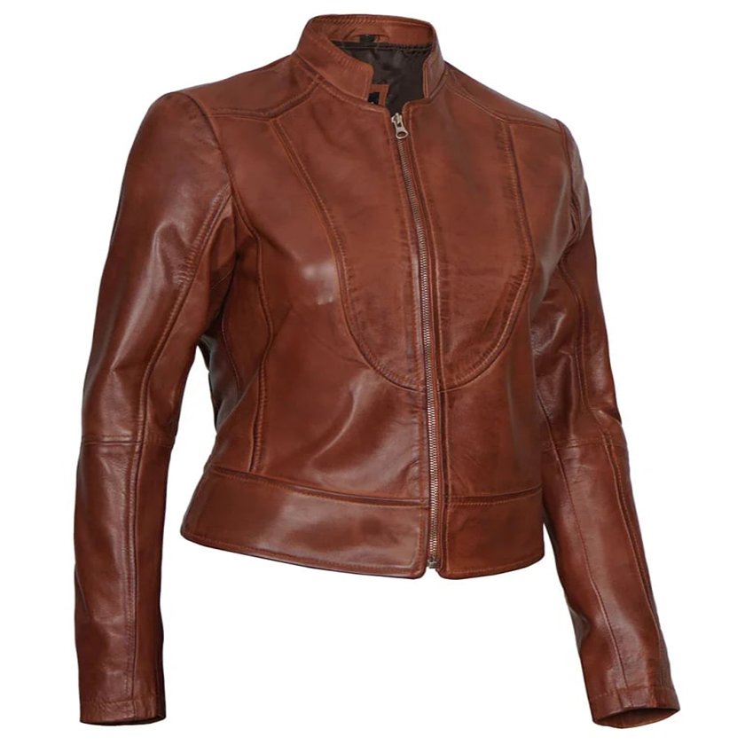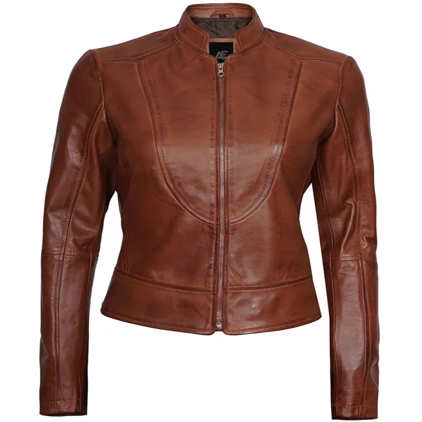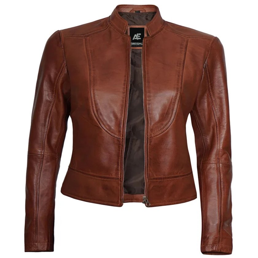 Looking for a jacket that is a little edgy and a little retro? The women’s cognac biker leather Jacket is the perfect jacket for you. The jacket is made of high-quality genuine leather, it has a zip closure and upright collar style. You will stand out in the crowd with this unique design.