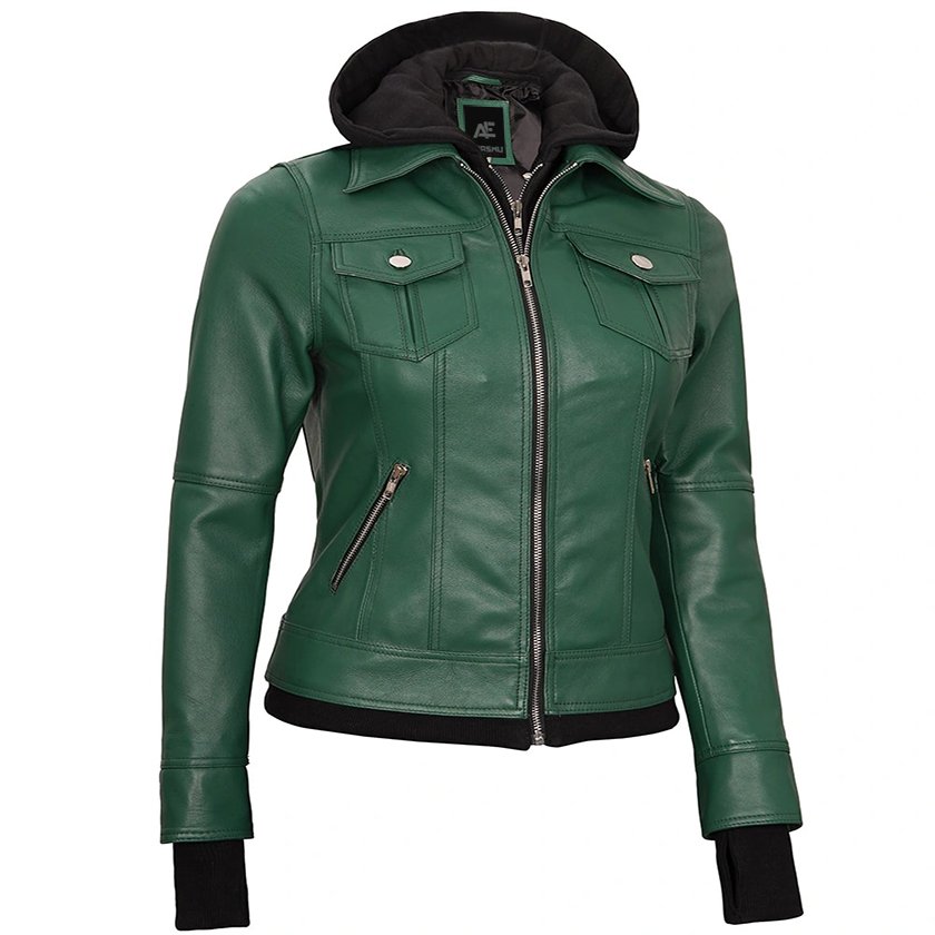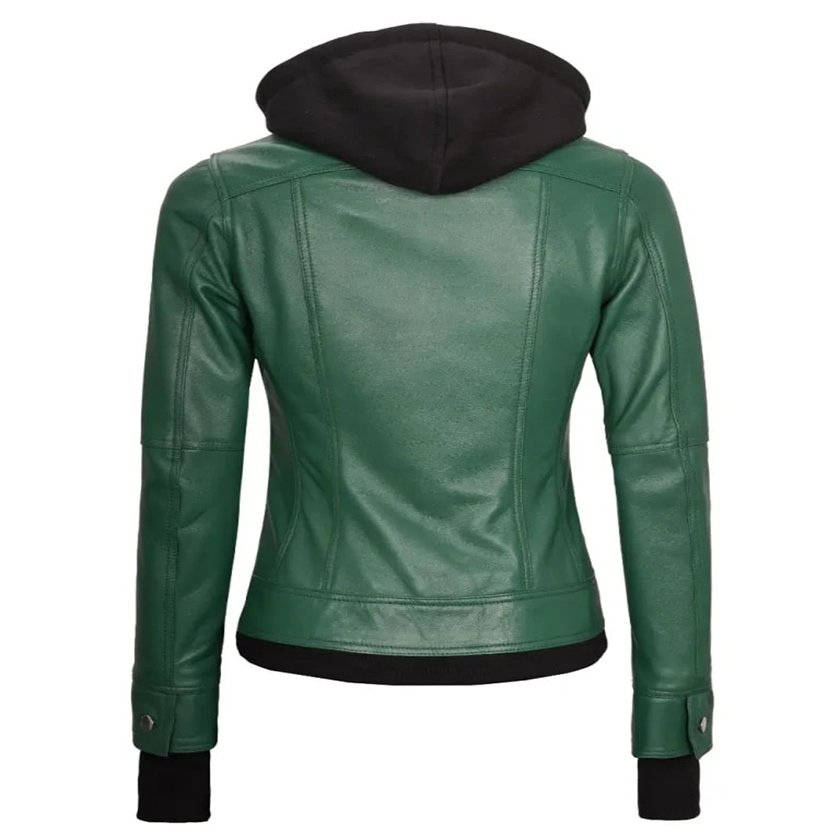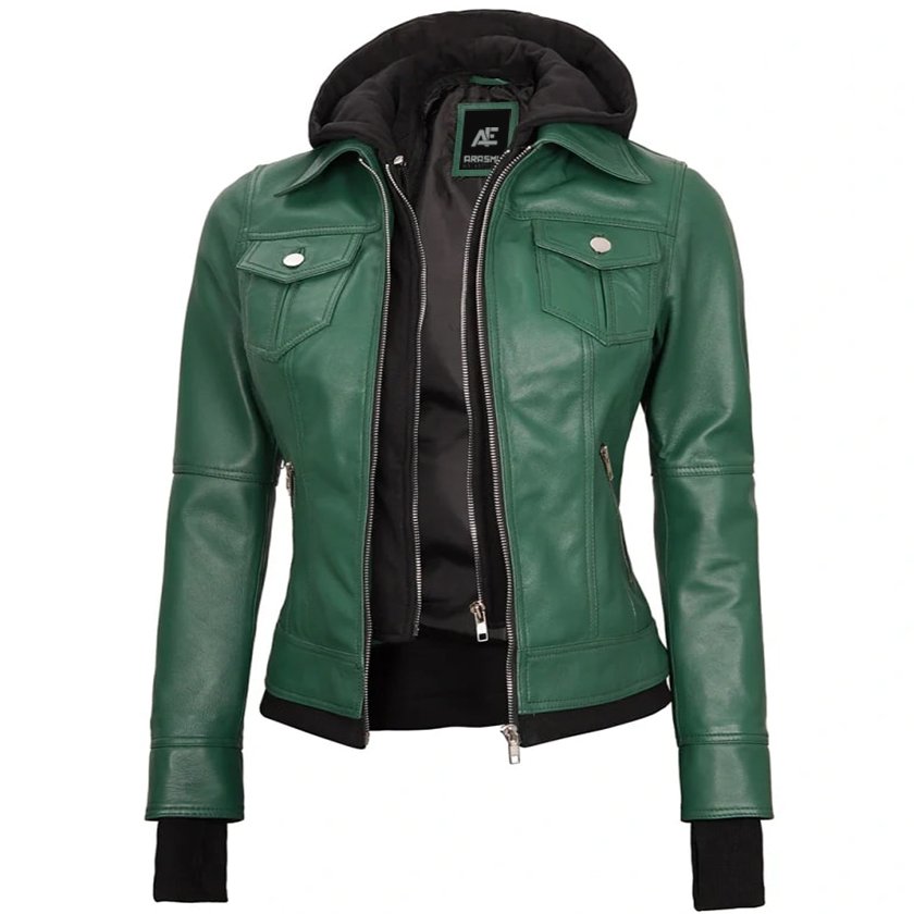 Revitalize your wardrobe with our Women’s Green Fitted Bomber Leather Jacket. Tailored for a sleek fit, it exudes style and comfort. The removable hood adds versatility, allowing you to effortlessly transition from day to night. Elevate your fashion game with this chic and dynamic statement piece.
